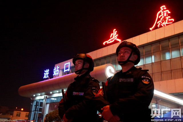 2019年12月31日晚兩名特警隊(duì)員在陜南安康火車站廣場(chǎng)立崗(央廣網(wǎng)發(fā) 郝黎俊 攝)