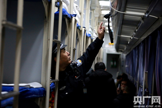 2019年12月31日晚乘警長(zhǎng)衛(wèi)志軍在臥鋪車廂巡視提醒旅客將行李架上的背包安全擺放(央廣網(wǎng)發(fā) 郝黎俊 攝)