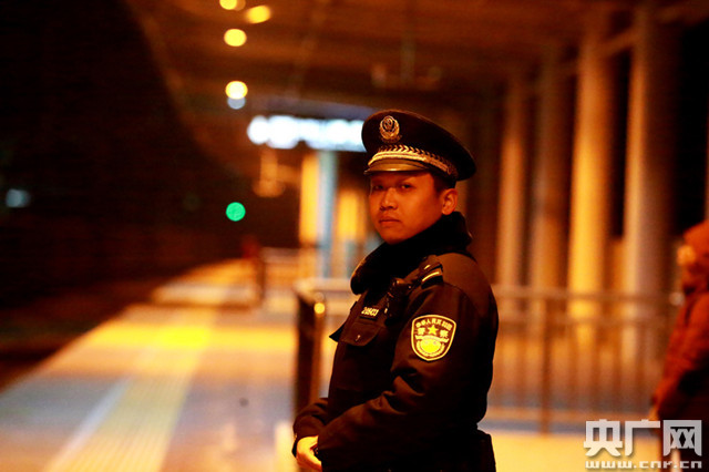 2019年12月31日晚鎮(zhèn)安車站站臺(tái)上新警田磊立崗(央廣網(wǎng)發(fā) 郝黎俊 攝)