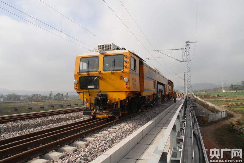 “新建的鐵路不是立馬就能讓火車在鐵道上奔跑的,還需要通過大型養路設備進行線路整修,才能達到列車上線運行的標準。”中國鐵路昆明局集團昆明工務機械段現場作業負責人李飛介紹,“剛安放好鋼軌的線路還存在著底部石砟不足,鋼軌平直度不夠,軌道間距不一等問題,只能供施工列車慢速通行,需要經過多次整修,才能使線路達標,滿足客貨列車開行條件。”