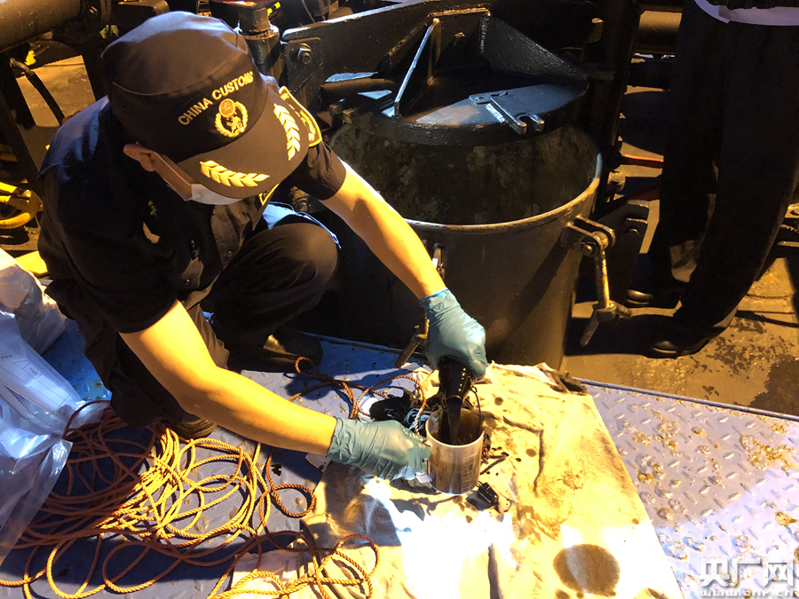 圖為深圳海關工業品檢測技術中心人員在深圳鹽田港碼頭在油污水卸載船上提取樣品 唐佳偉 攝