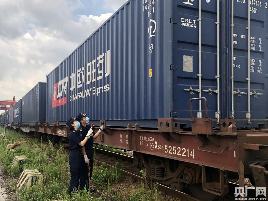廣州海關(guān)所屬廣州車站海關(guān)關(guān)員對發(fā)運前的班列集裝箱標識號進行核查 (央廣網(wǎng)發(fā) 海關(guān)供圖)