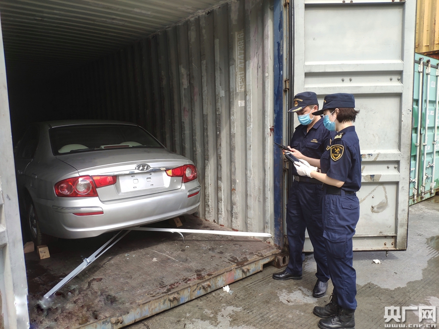 廣州海關(guān)所屬廣州車站海關(guān)關(guān)員對發(fā)運的二手車進行查驗 (央廣網(wǎng)發(fā) 海關(guān)供圖)