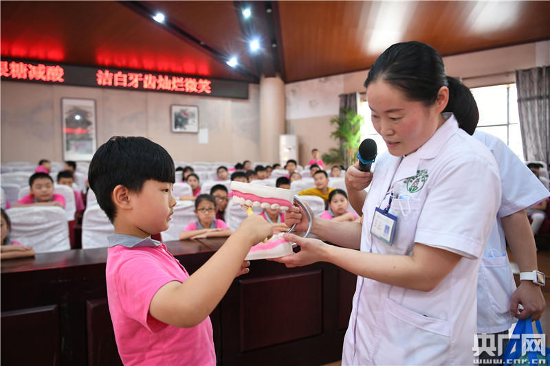 醫生正在向同學們講解正確的護牙方式。(央廣網發 蘇玲攝)