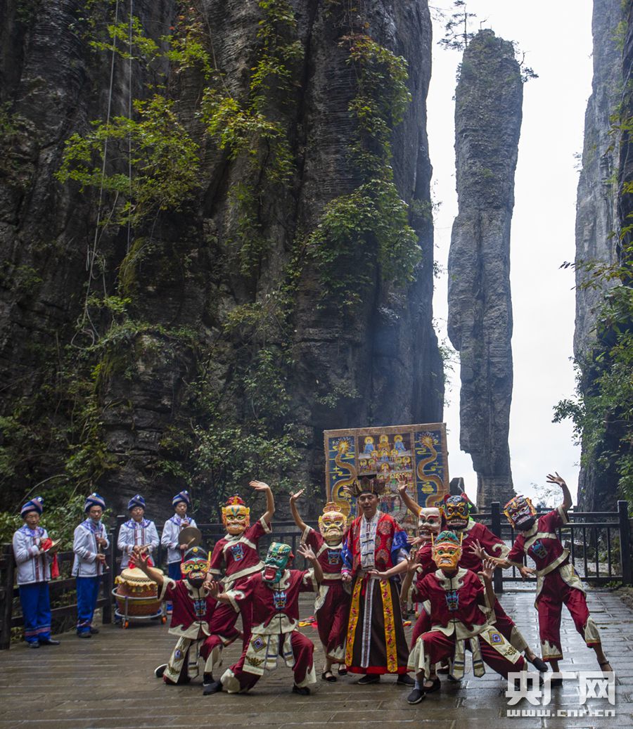 大峽谷“一炷香”景點處恩施儺戲表演(央廣網發 通訊員向艷攝)
