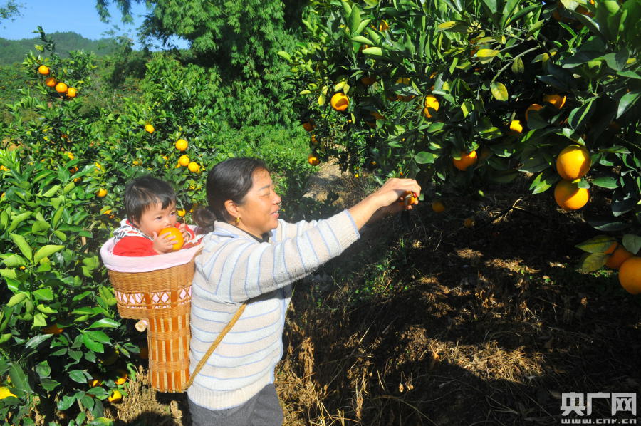 在江西省贛州市全南縣南逕鎮三峽移民新村蔡祖富的臍橙園,一家三口人高興地開始采摘臍橙(央廣網發 通訊員供圖)