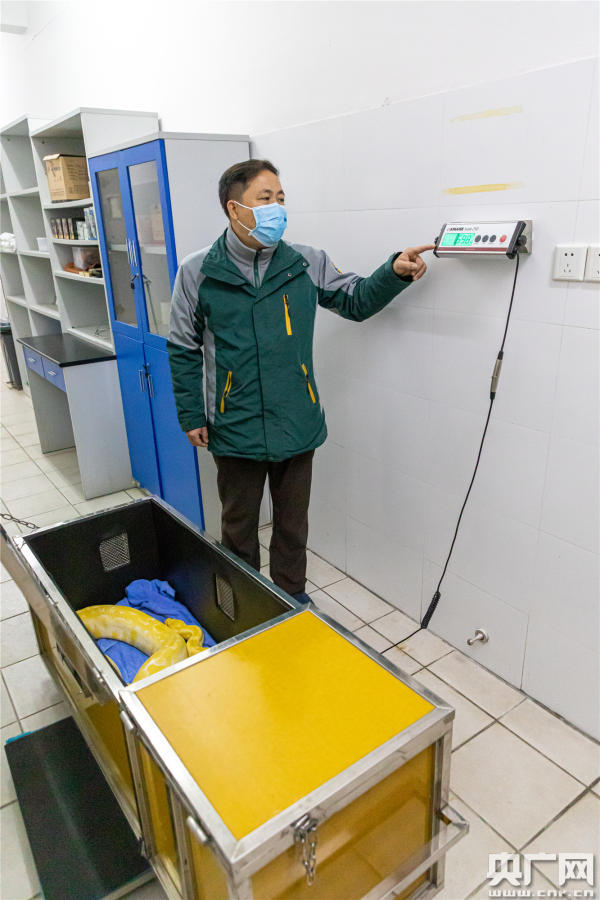為了能準確稱量黃金蟒的體重,保育員找來了大保溫箱上“秤盤”(央廣網發 通訊員供圖)