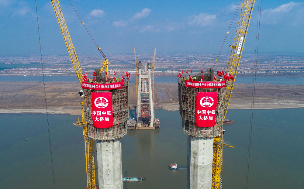 據(jù)了解,大橋橋址處河床地質(zhì)復(fù)雜,主塔墩樁基鉆孔深度最長達(dá)到了110米,為國內(nèi)高鐵建設(shè)中樁基施工深度之最。中鐵大橋局五公司安九項目總工程師劉濤介紹,針對5號墩主塔高和全程都在水上作業(yè)的施工難點(diǎn),項目部特研發(fā)了大堤斜坡面深水矩形承臺施工工法、旋挖鉆加回轉(zhuǎn)鉆組合鉆孔工藝,并采用國內(nèi)首創(chuàng)的橋梁全面智能化溫控系統(tǒng)確保大體積混凝土施工質(zhì)量。大橋于2017年10月開工建設(shè),目前已完成全橋總工作量的三分之二。