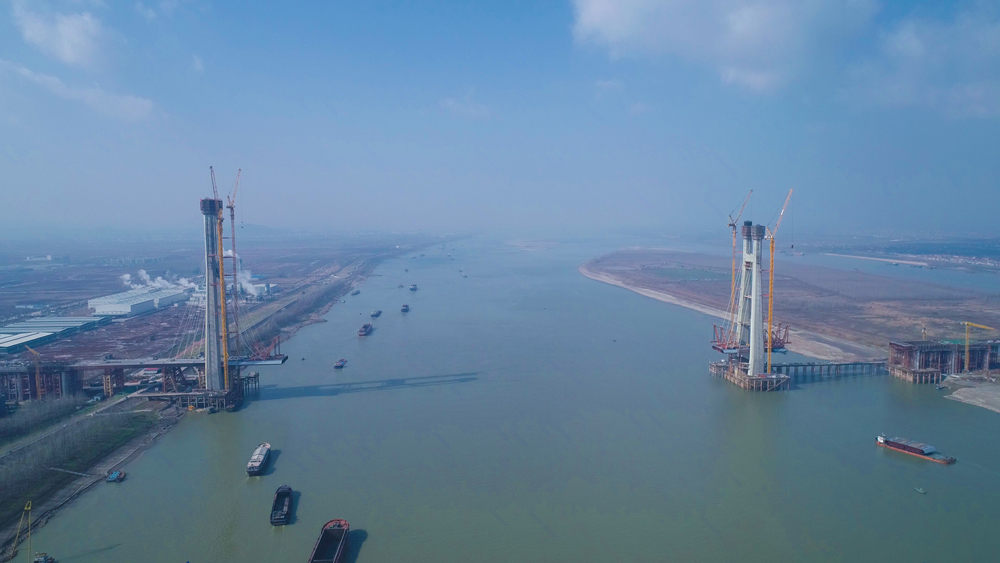 此次封頂?shù)?號墩主塔位于九江側(cè)永安堤防護(hù)堤邊坡上,屬于H型結(jié)構(gòu),高達(dá)242米,相當(dāng)于80層樓房高。建設(shè)者們采用液壓爬模分段施工,塔柱共41個節(jié)段,混凝土澆筑總方量為3.17萬立方米。