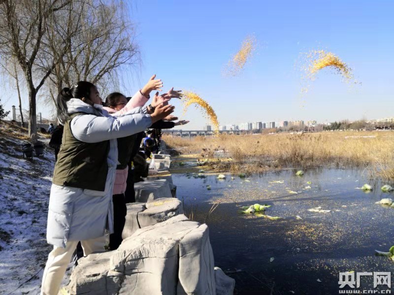 志愿者在青島市城陽區白沙河濕地撒放食物,助鳥類過冬(央廣網發 王海濱 攝)