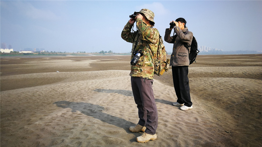 志愿者在洲頭沙灘開展黑鸛保護巡護(央廣網發 武漢市觀鳥協會供圖)