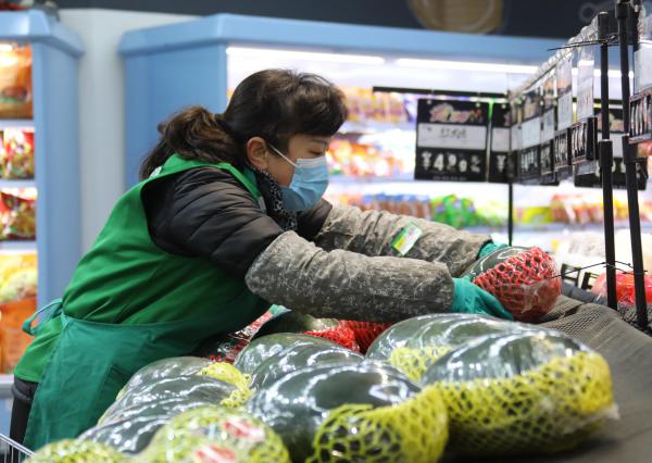 在固安縣一家大型超市內,超市工作人員正在擺放水果(央廣網發 門叢碩 攝)