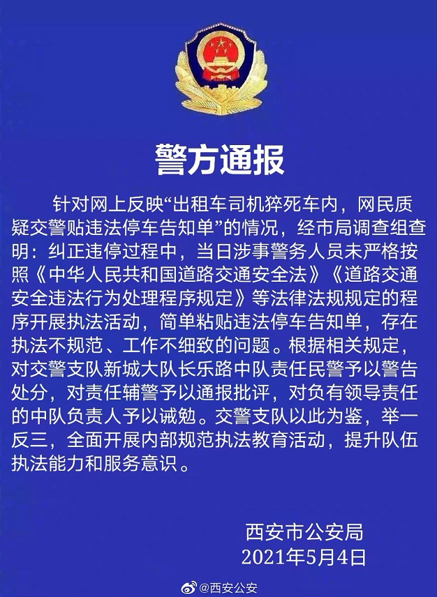 央廣網西安5月5日消息(記者舒隆煥 劉昱)5月1日,陜西西安一出租車司機在車內猝死,交警被指貼罰單時未及時發現,該事件引起熱議。5月4日23時許,西安市公安局通報,針對網上反映“出租車司機猝死車內,網民質疑交警貼違法停車告知單”的情況,經調查,涉事警務人員存在執法不規范、工作不細致的問題。根據相關規定,該局對3名涉事警務人員進行處分。