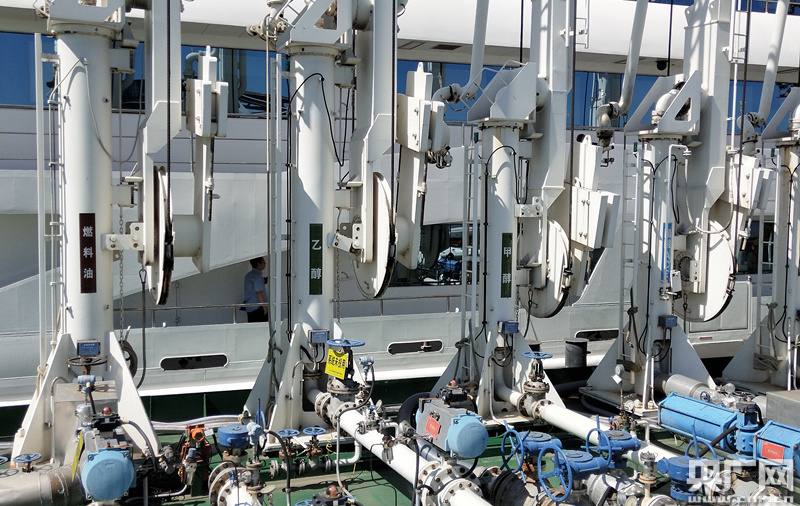 南京龍翔洗艙水接收轉運碼頭,一排排管線正等待著裝載洗艙水的船舶停靠。(央廣網記者 黃炎秋 攝)
