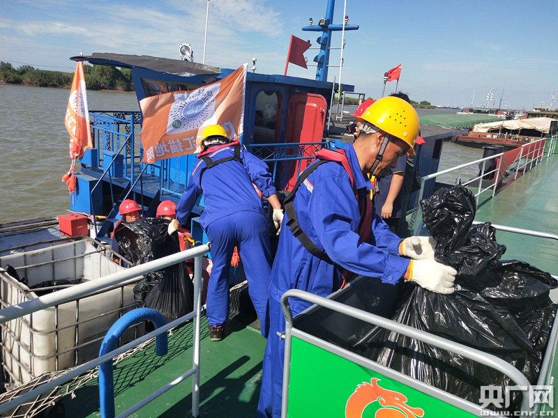 水上服務區工作人員正在將生活垃圾轉運至垃圾收集船上(央廣網記者 黃炎秋 攝)