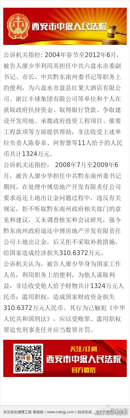 中國網1月22日訊 22日上午,貴州省委原常委、遵義市委原書記廖少華涉嫌受賄、濫用職權案,在陜西省西安市中級人民法院公開審理。西安中院官方微博“@西安中院”進行了直播。