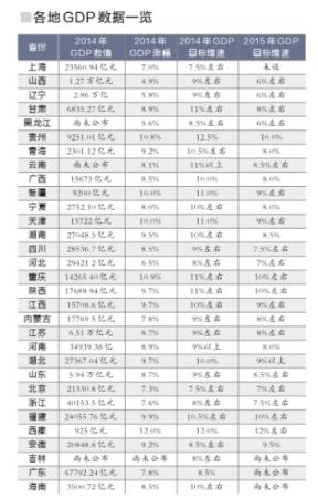 值得注意的是,伴隨著多地主動下調(diào)經(jīng)濟(jì)增長目標(biāo)的是,去年多地GDP增長并未達(dá)到預(yù)期。記者綜合各地統(tǒng)計(jì)局發(fā)布的數(shù)據(jù)發(fā)現(xiàn),除了吉林,目前全國已有30省份對外公布了2014年GDP增速。具體來看,西藏、貴州、重慶、天津、新疆等五地保持兩位數(shù)增長,其中西藏以12%的增速排名第一;山西等四地的2014年GDP增速低于全國,其中山西的增速為4.9%,增幅最低。