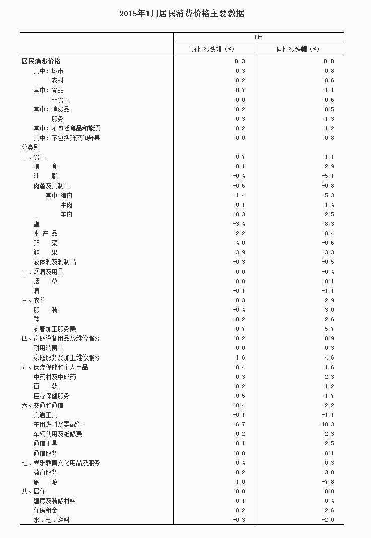 2015年1月份CPI同比上漲0.8%