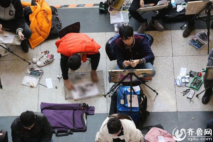 2月16日,2016年山東省藝考校考正式拉開帷幕,在濟南舜耕國際會展中心美術(shù)類專業(yè)考場,一位用腳畫畫的學生引起了記者注意。與其他考生不同的是,他的畫板沒有放在支架上,而是直接放在考場大理石地面上,今天的最高氣溫只有8度,這位考生赤著雙腳完成了考試。圖為一位考生用腳畫畫。 白少光 攝 圖片來源:齊魯網(wǎng)