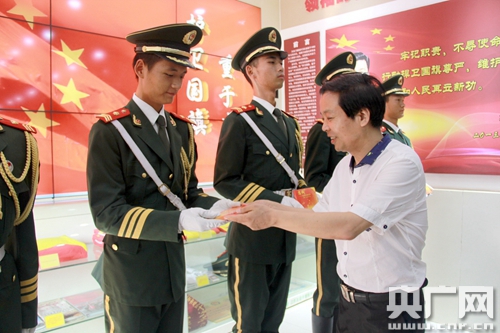 劉錦代表海南省婦聯和海南婦女群眾向國旗護衛隊官兵致以崇高的敬意和親切的慰問,并邀請曾在軍旅生涯中榮獲過四次三等功、十一次嘉獎、對部隊有著特殊情懷的王京忠先生一道向他們贈送由海南省賦蓮婦女兒童活動中心攝制、國旗護衛隊演唱的《忠誠》(又名《忠誠衛士之歌》)公益音樂片視頻光盤和“魚水深情同心寫忠誠,軍民攜手共筑中國夢”的錦旗,以表達婦女群眾與部隊官兵“同呼吸、共命運、心連心”的軍民魚水情誼。政委王建華代表國旗護衛隊全體官兵對海南省婦聯及半月談雜志社的關心和支持表示衷心感謝,并表示:“國旗是民族尊嚴的象征、是國家主權的代表,能成為國旗護衛隊的一員是我們衛隊每位官兵的榮譽與驕傲,我們定當誓死護衛,不辱黨和人民賦予我們的神圣使命。”