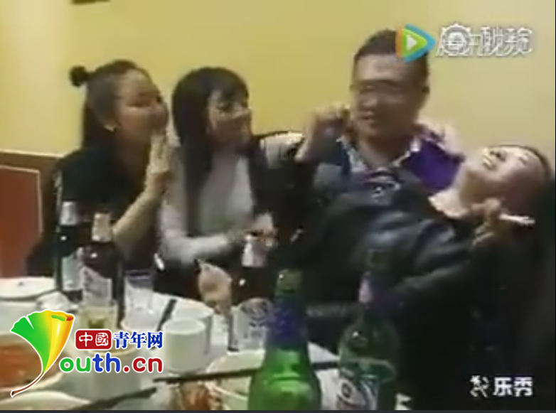 網(wǎng)傳視頻中,一名男子在酒桌旁懷抱三名女性調(diào)笑嬉戲,言語露骨,期間兩名女子疑似親吻男子身體。