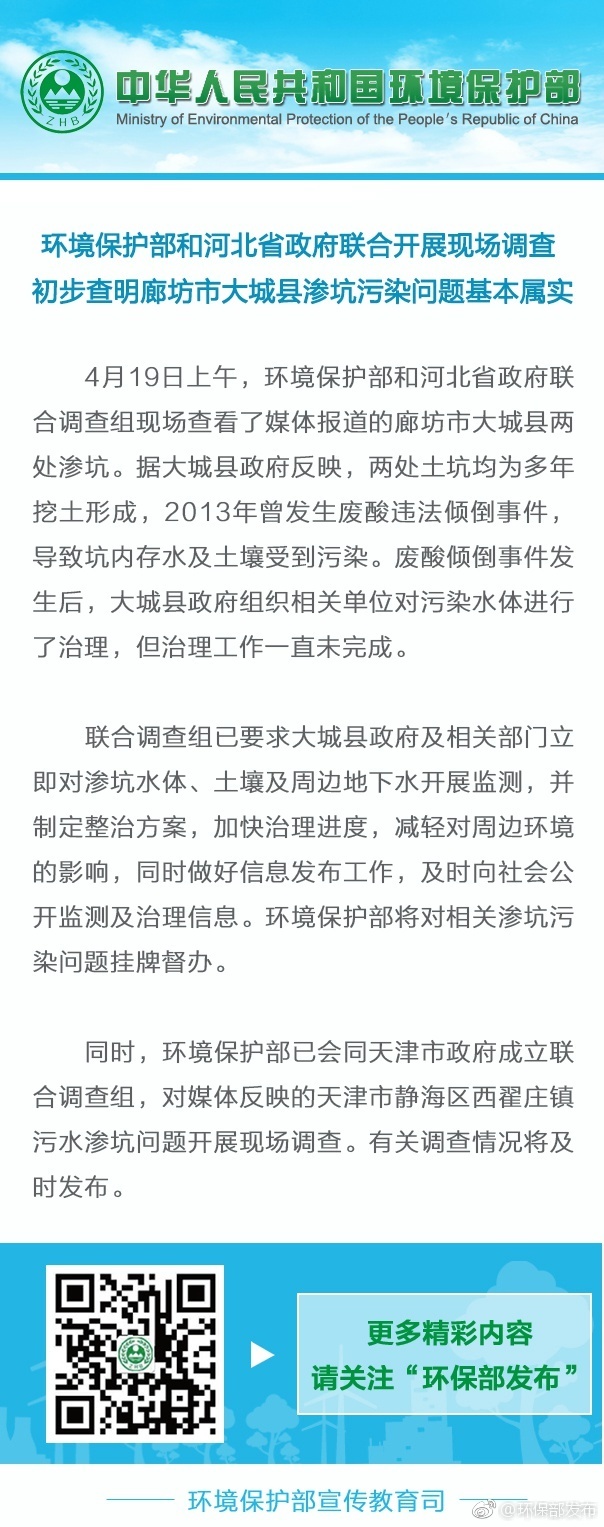 央廣網(wǎng)北京4月19日消息 據(jù)環(huán)境保護(hù)部宣傳教育司官方微博消息,環(huán)境保護(hù)部和河北省政府聯(lián)合開展現(xiàn)場調(diào)查,初步查明廊坊市大城縣滲坑污染問題基本屬實(shí)。