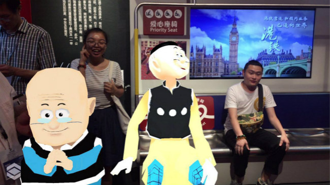 與老夫子漫畫(huà)人物拍照: 駐粵辦開(kāi)發(fā)了一個(gè)拍攝擴(kuò)容實(shí)景的手機(jī)程序,專(zhuān)們給參觀香港館的人士在館內(nèi)下載至自己的手機(jī),與虛擬的香港原創(chuàng)卡通人物”老夫子”坐在地鐵座椅上拍照留念。