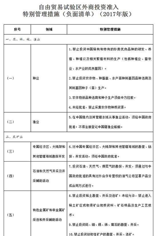 《自由貿易試驗區外商投資準入特別管理措施(負面清單)(2017年版)》全文: