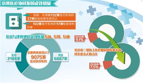 “目前,京津冀132家醫療機構27項檢驗結果實現互認,102家醫療機構有17項檢查資料共享。北京與津冀地區實現醫保互認、互聯、互通,僅京冀兩地就互認了9075家定點醫療機構,其中北京2188家,河北6887家。2016年北京市二級以上醫療機構出院患者中,河北患者人數占比從2013年的9.1%下降到7.5%,京冀醫療協同發展成效初顯。”北京市衛計委委員、新聞發言人高小俊介紹。