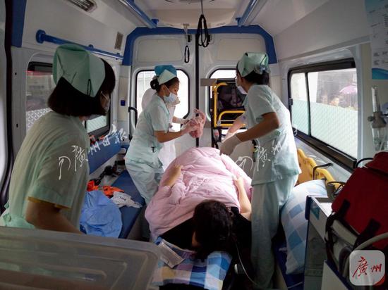 “憋住氣,加油!出力!”葉發卓不斷引導麥女士發力,一旁的謝麗紅、鄺淑芬兩位急診護士鋪開生產包上的各種工具,隨時準備嬰兒落地后的護理措施。此時,麥女士的疼痛一下接著一下,越來越頻繁,嬰兒的頭部在母親的發力下逐步挪動出來,葉發卓不斷鼓勵麥女士,告知孩子出來狀況,旁邊的人不斷喊“加油”。加油聲和孕婦的呻吟聲交雜在救護車小小的空間內,車上的人屏著氣等待著新生兒的哭叫聲。