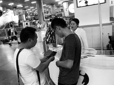記者拿著一張交通卡找到其中一名短發男子,該男子拿出自己的手機,點開了屏幕上“e樂充公交卡”的App軟件,界面里面有一個公交卡充值的按鈕,再點進去出現一個藍色界面,將一卡通放在手機背面,屏幕上顯示一長串數字,下面顯示余額“12元”。“退卡少給你5元錢。”看到記者對手機軟件有懷疑就說:“這軟件是正規軟件,顯示的余額和退卡窗口顯示是一致的。”同時指著站廳東邊的公用電話廳說:“那邊有公用電話,你將手里的一卡通插進去,查完余額再來找我。”