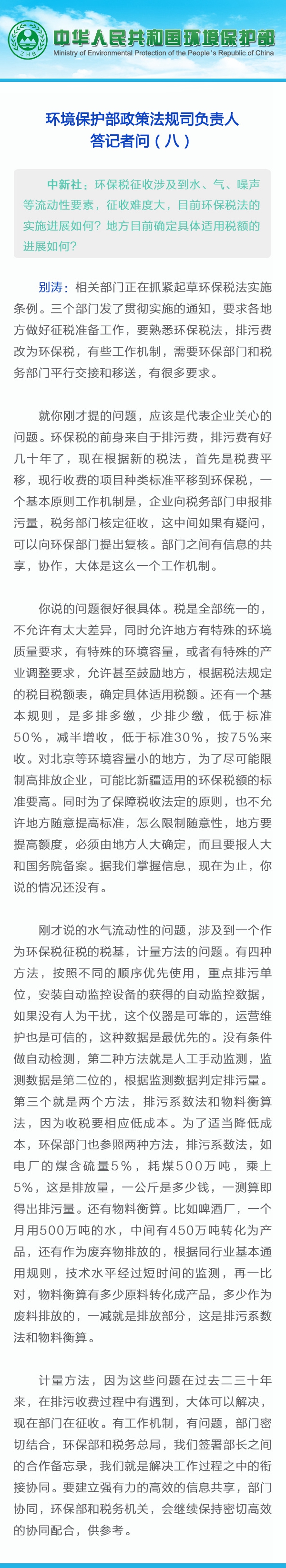 別濤表示,相關(guān)部門正在抓緊起草環(huán)保稅法實(shí)施條例。三個(gè)部門發(fā)了貫徹實(shí)施的通知,要求各地方做好征稅準(zhǔn)備工作,要熟悉環(huán)保稅法,排污費(fèi)改為環(huán)保稅,有些工作機(jī)制,需要環(huán)保部門和稅務(wù)部門平行交接和移送,有很多要求。