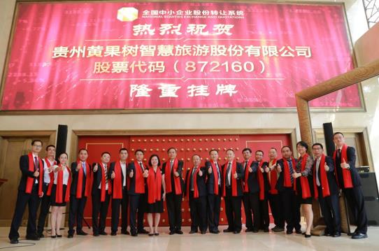 2017年9月13日,貴州黃果樹智慧旅游股份有限公司(以下簡稱智慧旅游公司)在全國中小企業股份轉讓系統舉行了新三板掛牌敲鐘儀式(證券簡稱:智慧旅游,股票代碼:872160)。 中共安順市委常委、市委副書記朱桂云,中共安順市委常委、安順市人民政府副市長文洪武,中共安順市委副秘書長宋春雨,安順市金融辦主任曹瑋,貴州黃果樹旅游集團股份有限公司董事長吳聲洪、總經理王金源、副總經理周若鵬,貴州黃果樹智慧旅游股份有限公司董事長張目及其他股東代表共同出席了智慧旅游公司的掛牌敲鐘儀式,見證了這一重要時刻。