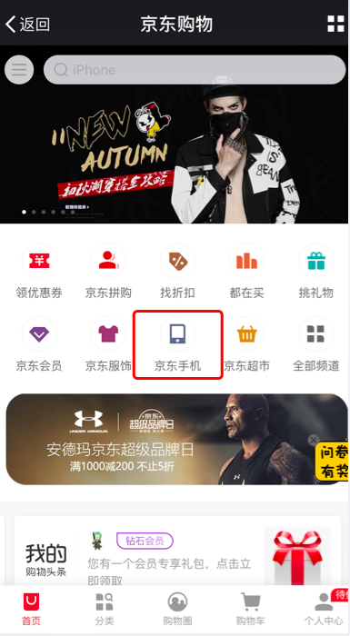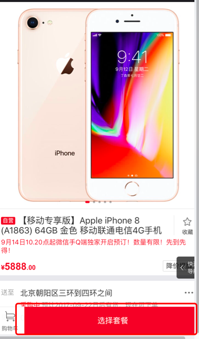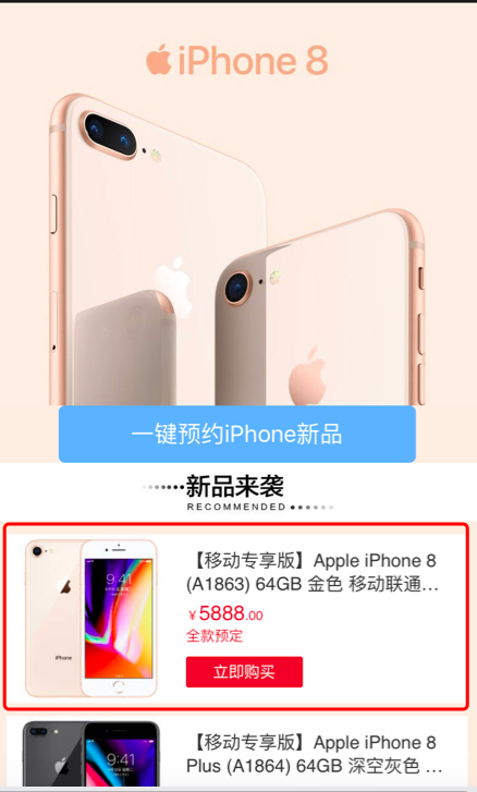 消費者可以在自己的微信“發現”頁面點擊“購物”,進入京東頁面點擊“京東手機”后,點擊iPhone 8新品上市的廣告,即可看到移動專項版的iPhone8售賣信息,點擊“立即購買”即可完成預購下單。具體操作示例如下:
