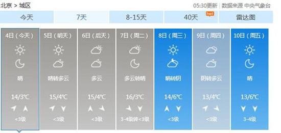 近期氣溫起起伏伏,晝夜溫差大,早晚氣溫偏低,提醒市民朋友,出門前需關注臨近預報,適時增添衣物,以免感冒。北京市氣象臺6時發布最新預報,今天白天晴間多云,北轉南風二三間四級,最高氣溫14℃;夜間晴間多云,南部地區有輕霧,南轉北風一二級,最低氣溫3℃。
