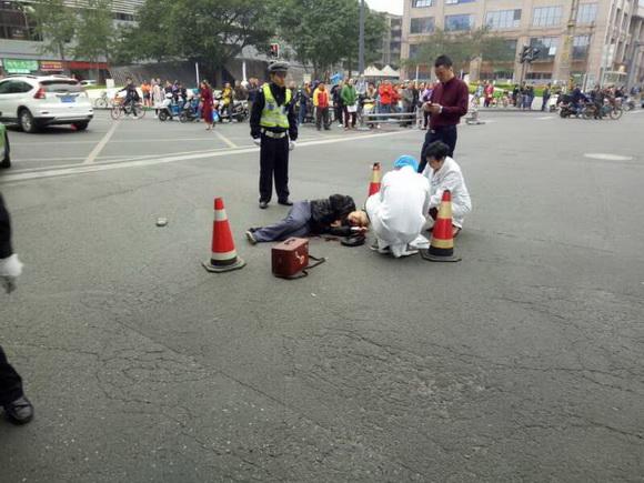 圖為老人落地后龔先程從附近醫院找來兩名醫生對老人進行急救