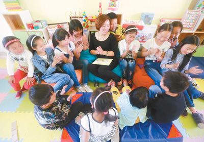 余莊村兒童福利主任郭惠與孩子們一起做游戲。 資料照片