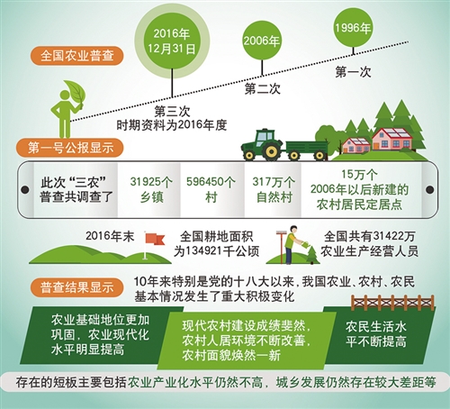 自2015年6月份起,國(guó)務(wù)院決定開展第三次全國(guó)農(nóng)業(yè)普查。此次普查的標(biāo)準(zhǔn)時(shí)點(diǎn)為2016年12月31日,時(shí)期資料為2016年度,共調(diào)查了31925個(gè)鄉(xiāng)鎮(zhèn),其中鄉(xiāng)11081個(gè),鎮(zhèn)20844個(gè);596450個(gè)村,其中556264個(gè)村委會(huì),40186個(gè)涉農(nóng)居委會(huì);317萬個(gè)自然村;15萬個(gè)2006年以后新建的農(nóng)村居民定居點(diǎn)。