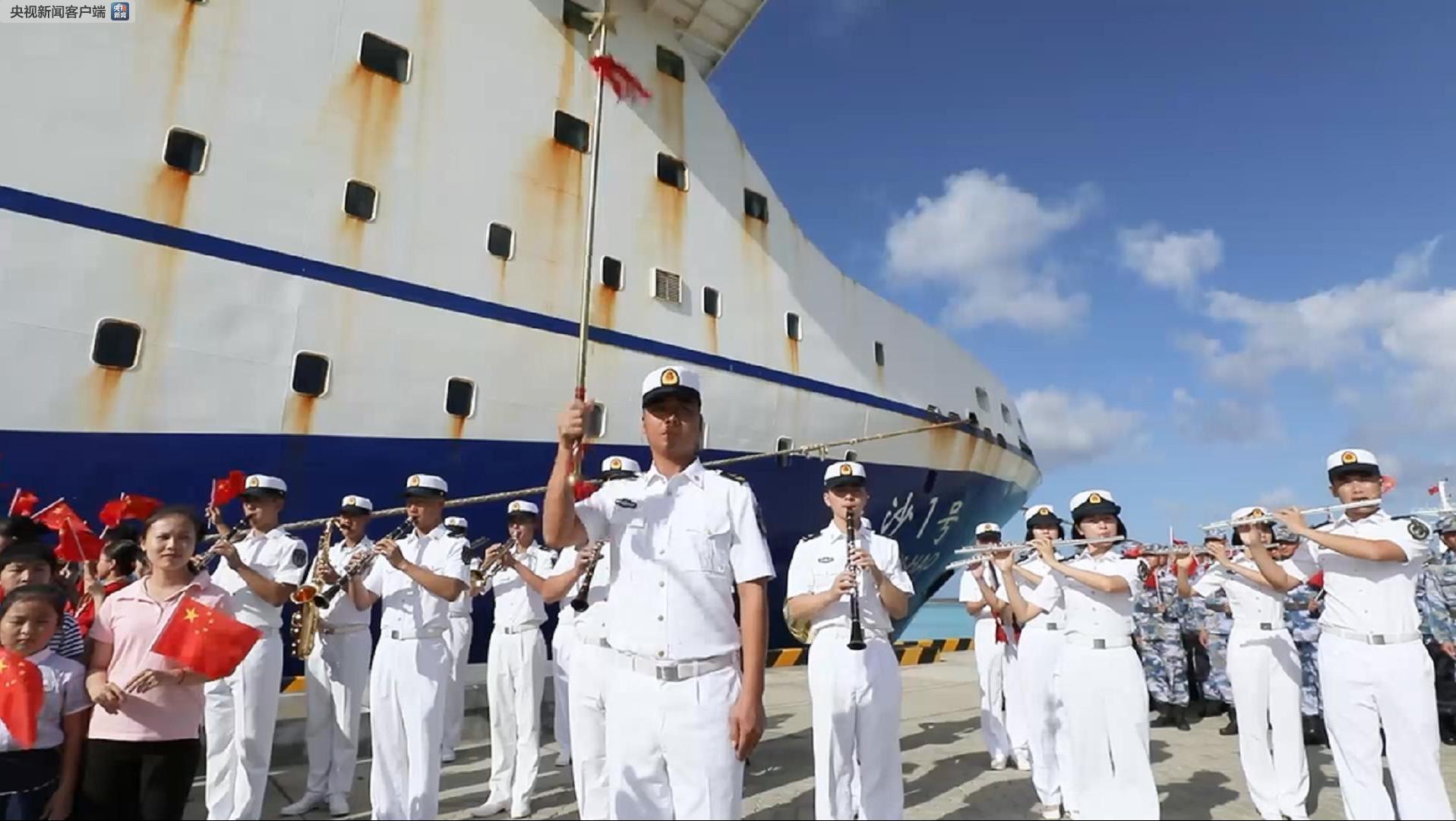 這時,甲板上突然響起了一陣溫暖的旋律,人們紛紛抬起頭,尋找聲音的來源。原來,甲板上、陸地上,91892部隊軍樂隊帥氣瀟灑的小哥哥、英姿颯爽的小姐姐們,正用手中的小號、長笛、小軍鼓、镲等十余種樂器共同奏響《我和我的祖國》優美而富有歌唱性的旋律。軍樂隊激動人心的演奏,回蕩在碧海藍天之間,喚醒三沙靜謐的清晨,吸引現場人群紛紛停下腳步,駐足觀看。
