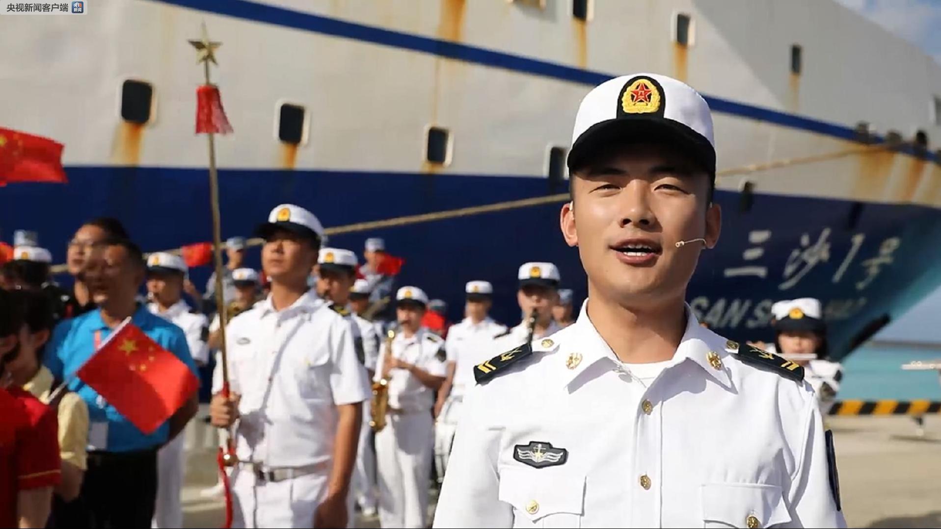 “我和我的祖國,一刻也不能分割。無論我走到哪里,都流出一首贊歌。”三沙海軍戰士李宗霖領唱歌曲。接著,三沙駐島戰士從遠處走來,齊聲高歌,意氣風發、豪情滿懷地歌唱,表達了對祖國的眷眷深情。