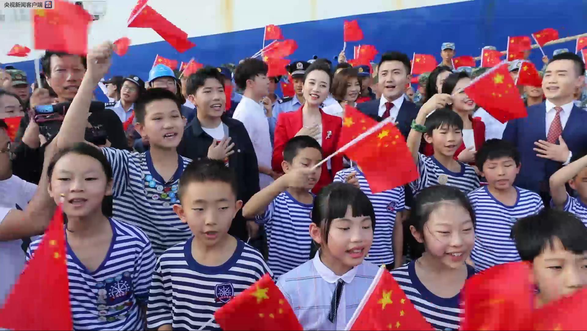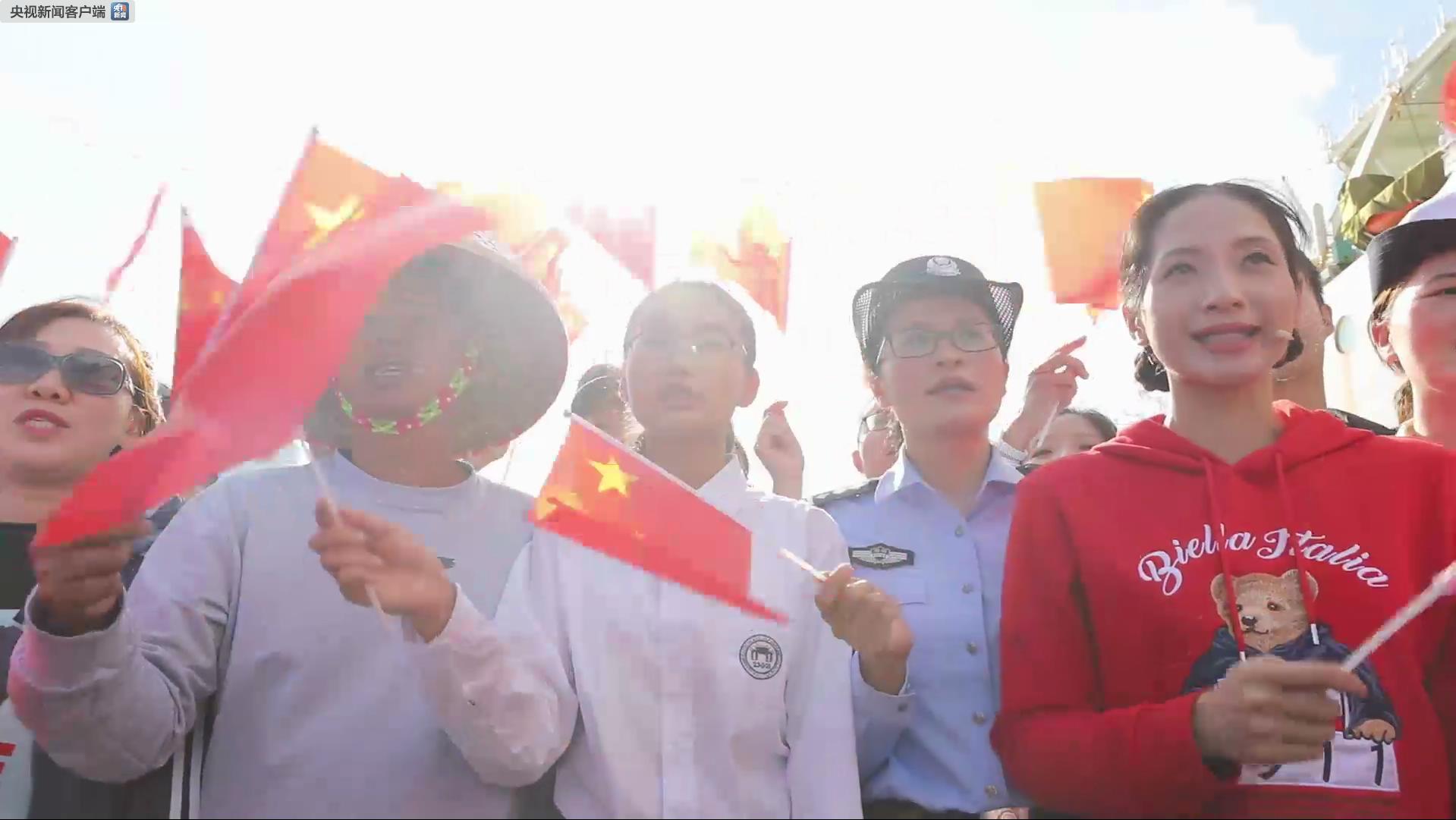 △三沙市工作人員、漁民和駐市部隊官兵揮舞著國旗,加入合唱