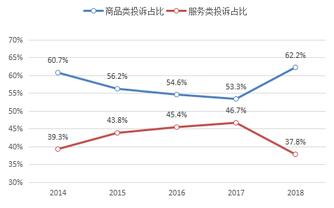 一是商品投訴比重擴大。2018年,全國市場監管部門共受理商品投訴231.81萬件,占比62.2%,同比增長61.3%,服務投訴140.75萬件,占比37.8%,同比增長12.1%。商品投訴主要集中在日用百貨、食品、家用電器、交通工具、通訊器材等領域。服務投訴主要集中在遠程購物、居民服務、互聯網服務、文化娛樂服務、修理維護服務等領域。