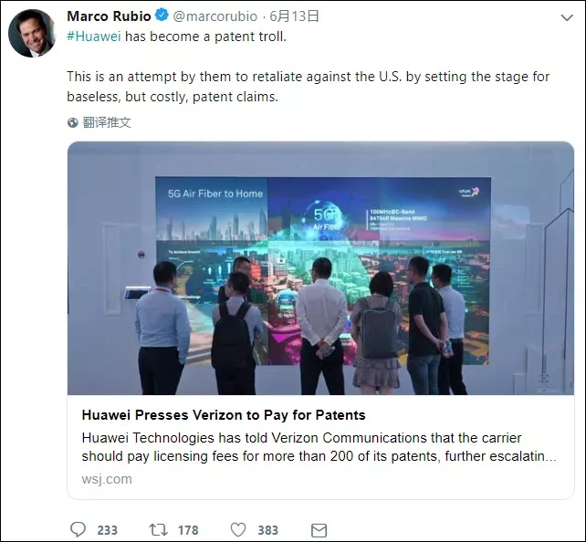 作為美國反華政客中最激進最極端的一個人,盧比奧多次叫嚷中國“偷”美國“知識產權”。但是聽到這個消息后,他立馬撤下了那套“捍衛者”的偽裝,給合理維權的華為扣上“專利流氓”的帽子,還宣稱華為的專利都是“沒有依據”的。