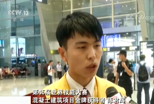 第45屆世界技能大賽混凝土建筑項目金牌獲得者 陳君輝:我們兩個也是第一次參加這個比賽,然后我們國家是第一次參加這個項目,對于很多東西,有很多默認(rèn)的潛規(guī)則,那些是我們不了解的,就是在這種情況下,我們?nèi)匀荒軌蚰玫焦谲姡@讓我覺得非常自豪。