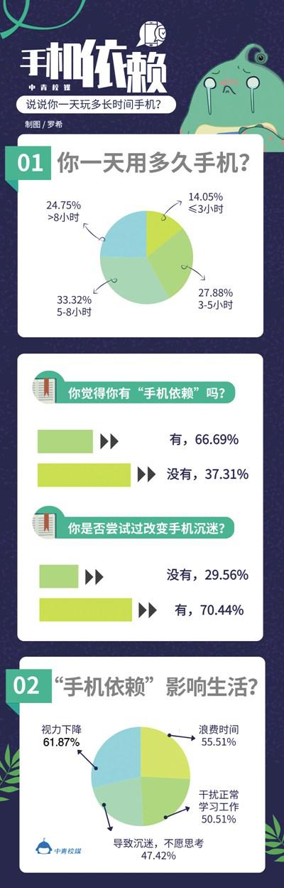中青校媒調(diào)查顯示,62.69%被調(diào)查者認(rèn)為自己過(guò)度依賴(lài)手機(jī)。被調(diào)查者中,80.75%的人認(rèn)為,長(zhǎng)時(shí)間使用手機(jī)是浪費(fèi)時(shí)間,最好可以適度使用。