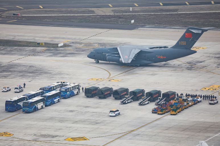 國產運20大飛機向武漢空運醫療隊員和醫療物資!