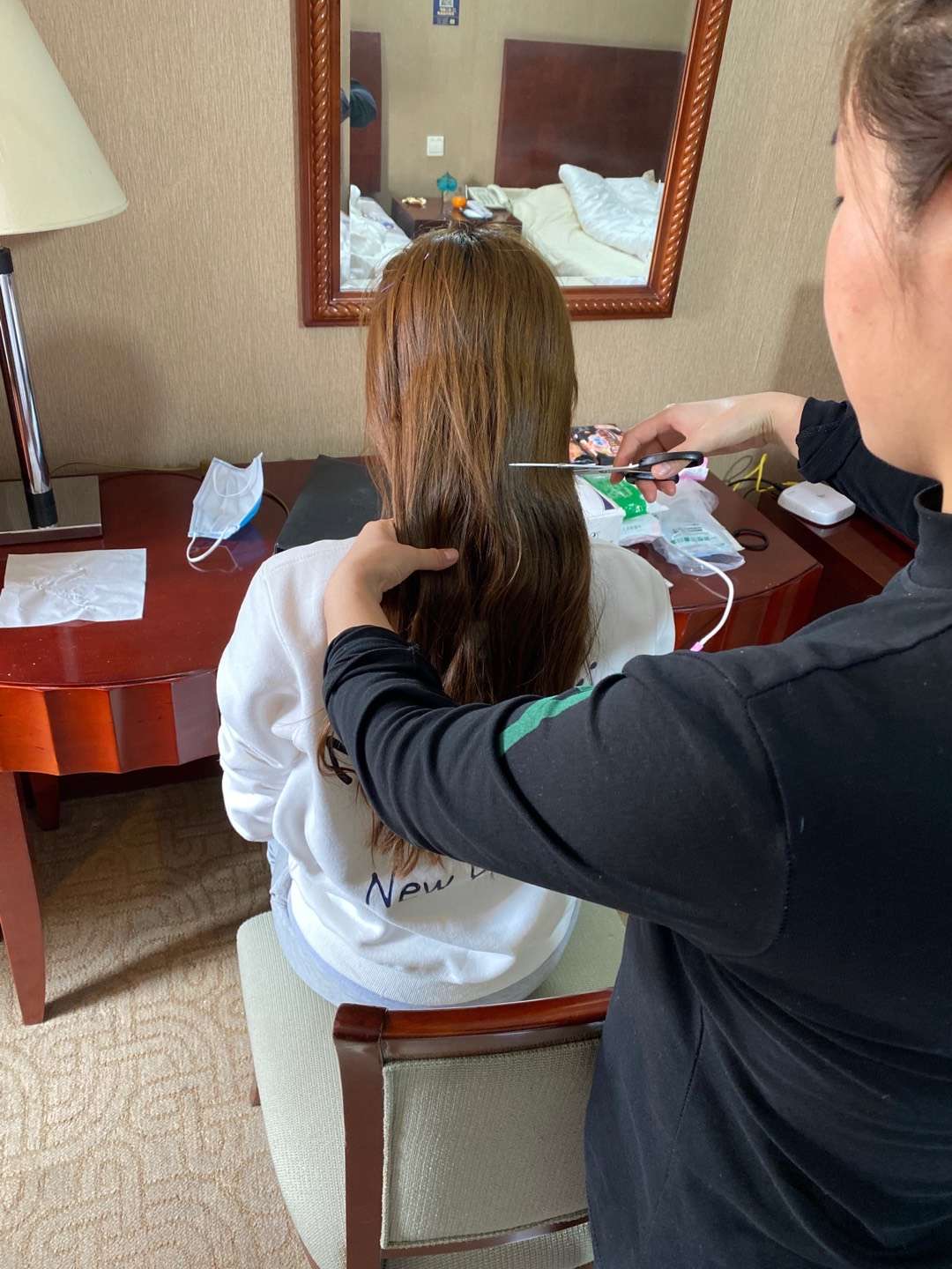 張霜:剪頭發完全是我個人自愿的行為,是來到武漢之后的第三天,我們幾個護士同事一起在宿舍里互相給剪的。我的頭發很長,留了十幾年都能到腰部了,這讓我在穿防護服,包括帶口罩、護目鏡、戴帽子的時候都很不舒服,頭發太多會頂到帽子和頸部,有的時候碎頭發還會包不住“跑出”防護服,這就增加了被感染的風險。同時,頭發長了,每次都要洗很長時間,也非常浪費時間。所以即便是舍不得剪掉,為了安全和方便,也不得不剪掉。