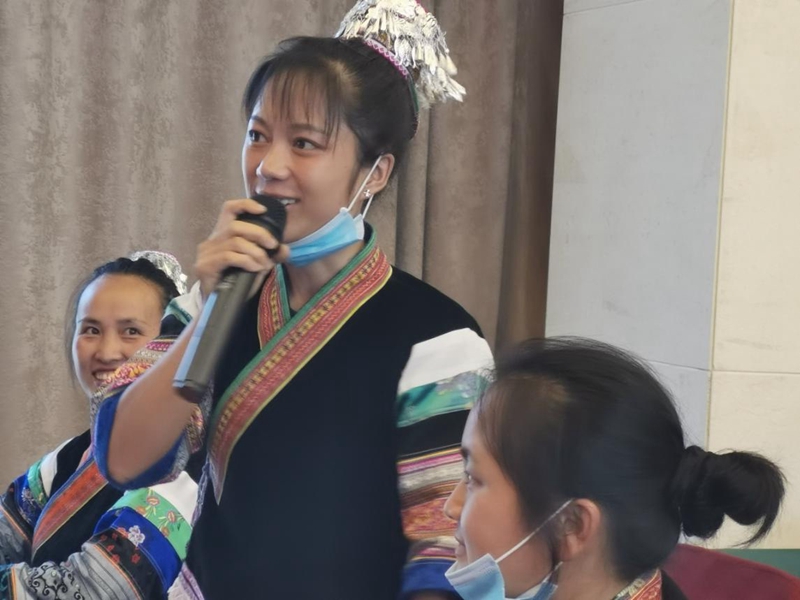 貴州織金導游蔡鳳在“新青年追夢計劃”培訓現(xiàn)場向老師提問(央廣網(wǎng)發(fā) 美團供圖)
