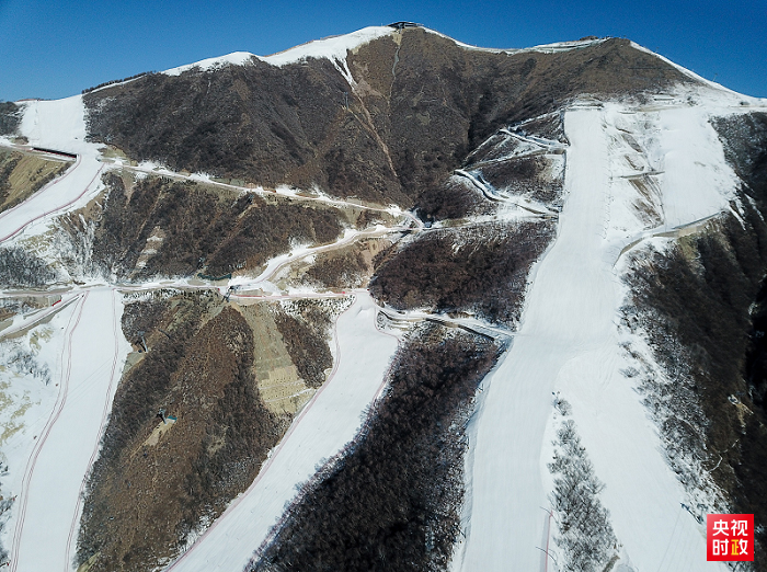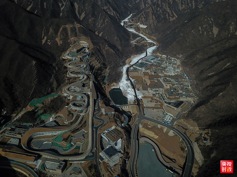 航拍國家高山滑雪中心、國家雪車雪橇中心、延慶冬奧村及山地新聞中心。四大場館剛剛峻工。依山而建的國家雪車雪橇中心形似蛟龍,是北京市冬奧工程競賽場館中設計難度最高、施工難度最大的新建場館。