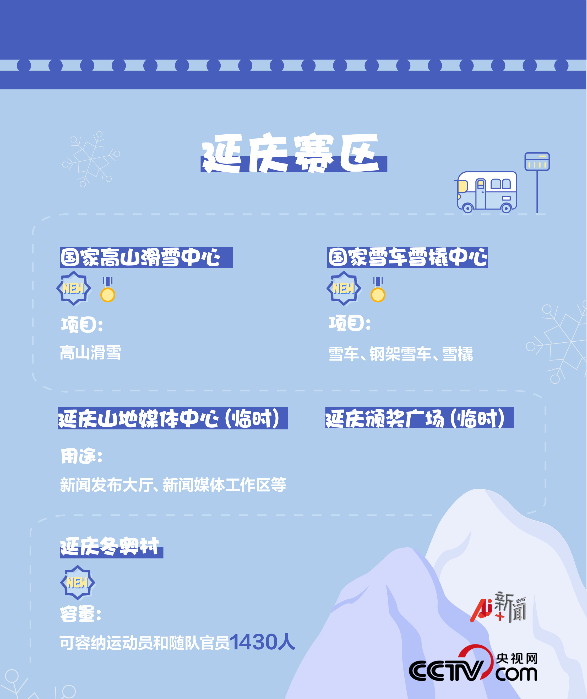 延慶賽區(qū)有3個非競賽場館,包括新建的延慶冬奧村和臨時建設(shè)的延慶山地媒體中心、延慶頒獎廣場。